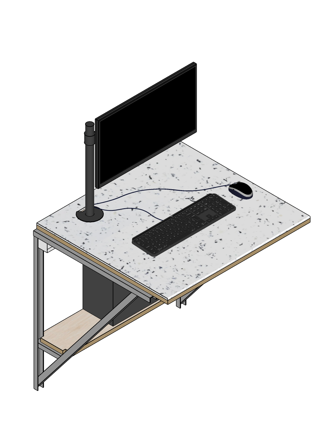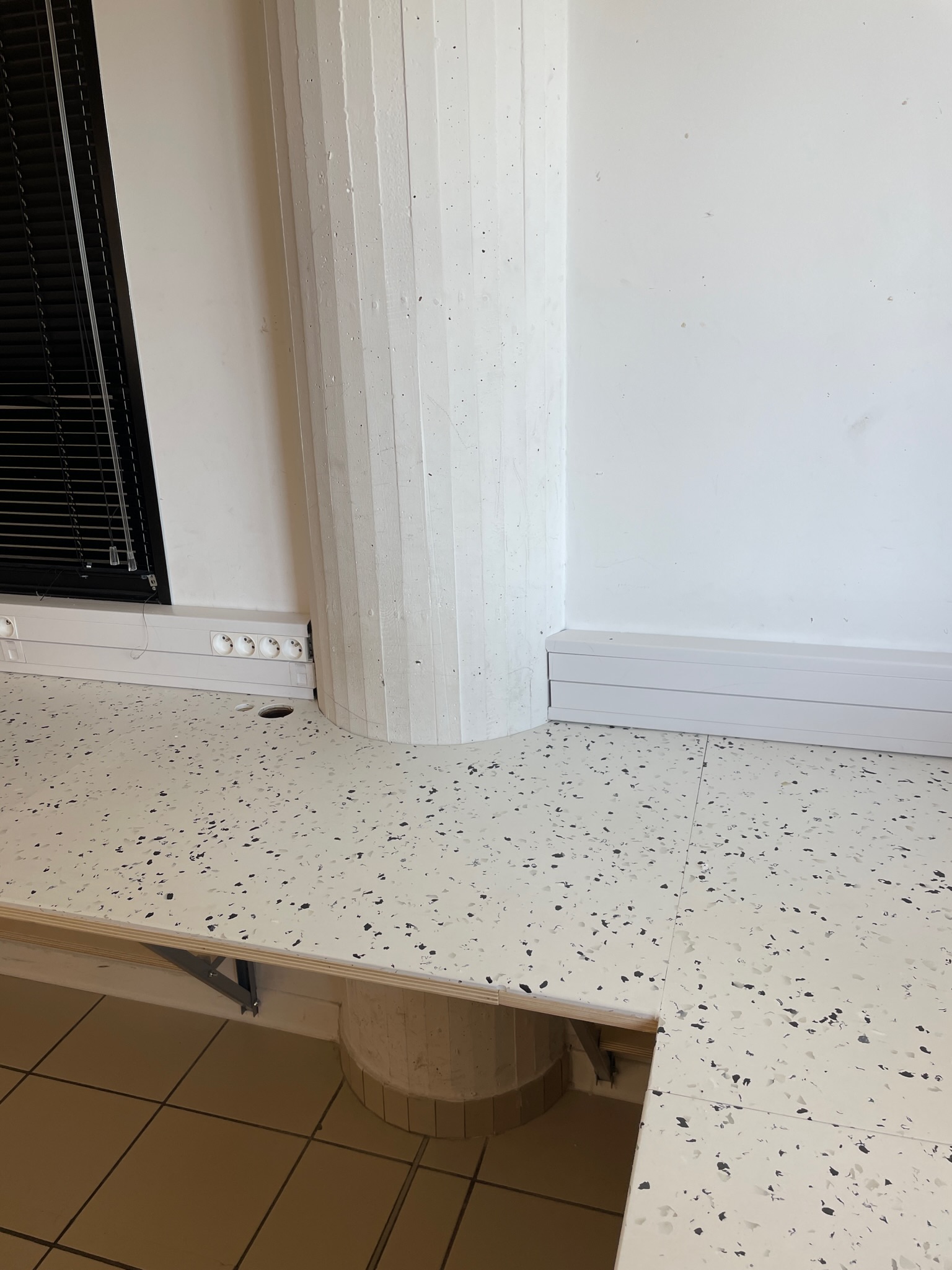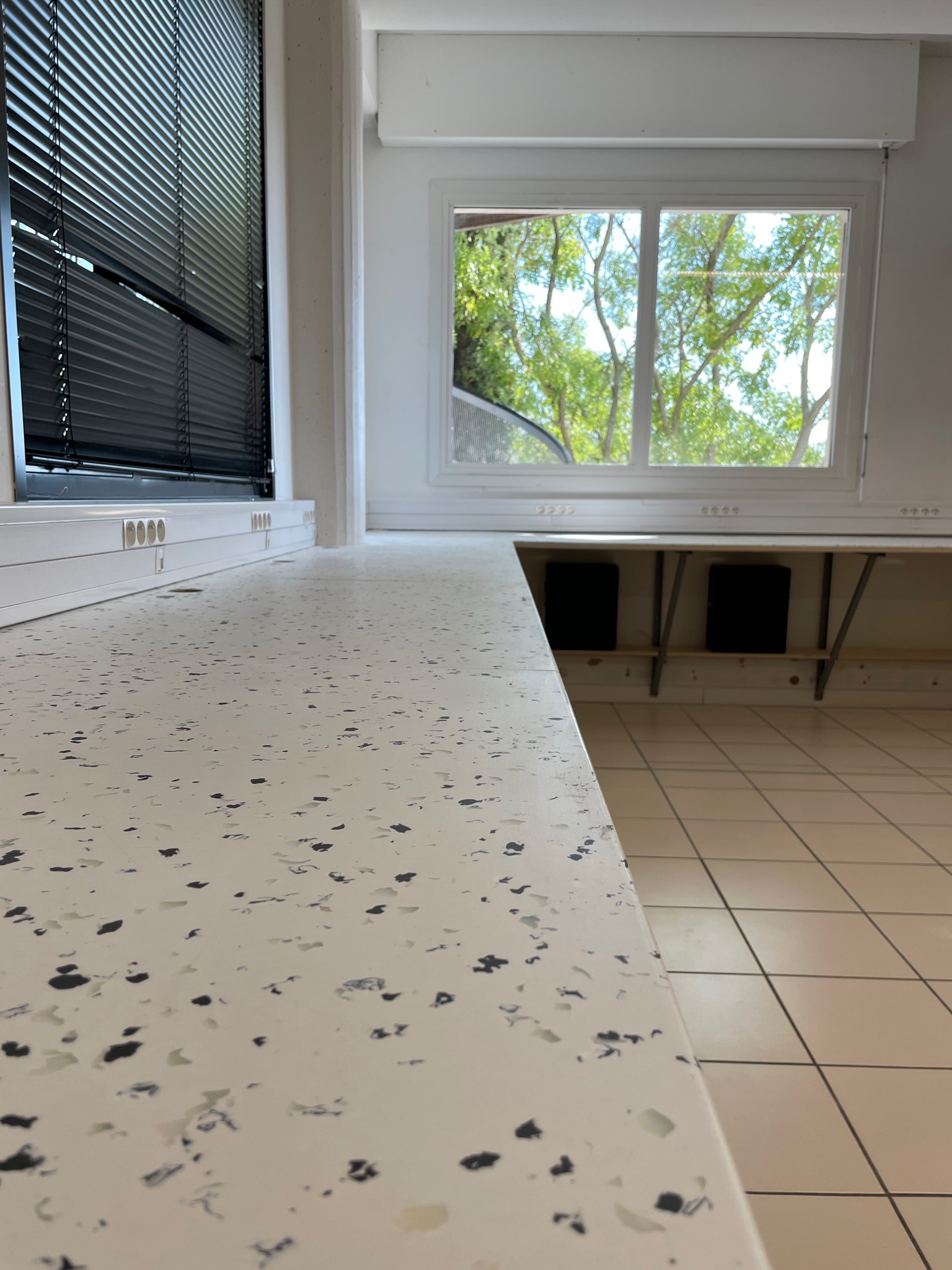 Les postes ont été réalisés sur mesure à partir d’un système de profilés U en acier thermolaqué, libérant au maximum l’espace au sol. Les plateaux, filants sur l’ensemble des structures sont conçus en contreplaqué peuplier, avec un revêtement en plastique recyclé. Au sein de ces piétements, chaque poste offre une tablette en partie basse, imaginée comme super de la tour PC.