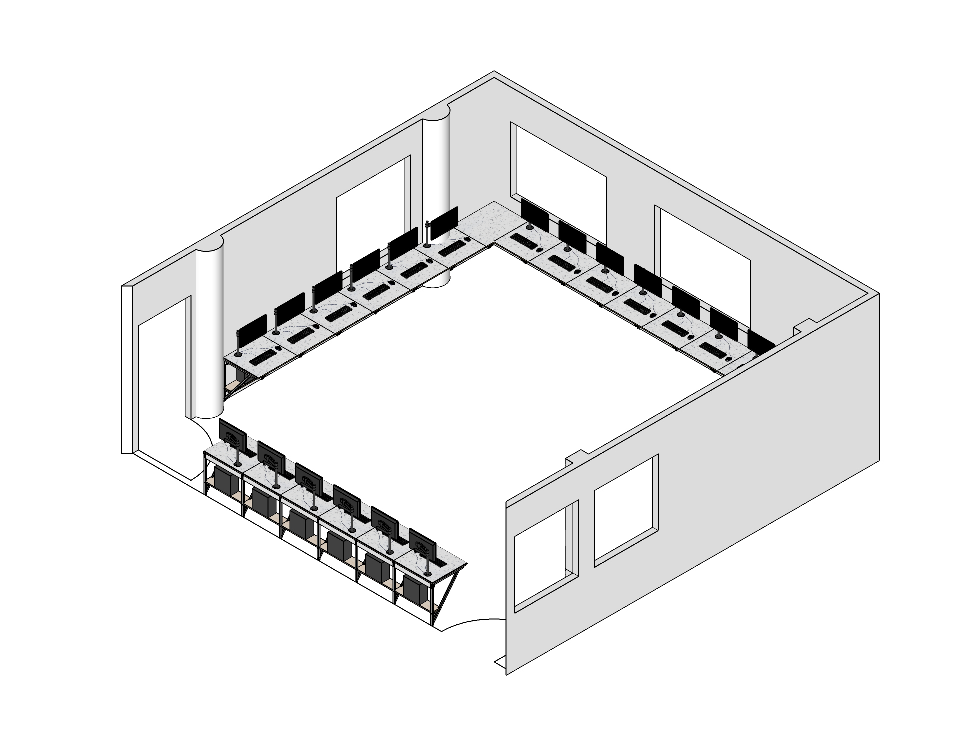 Aménagement d’une salle de cours pour accueillir le cursus « animation » de l’Ecole de Communication Visuelle. 21 postes de travail ont été conçus et réalisés en périphérie de la salle, afin de moduler l’espace central selon les besoins.