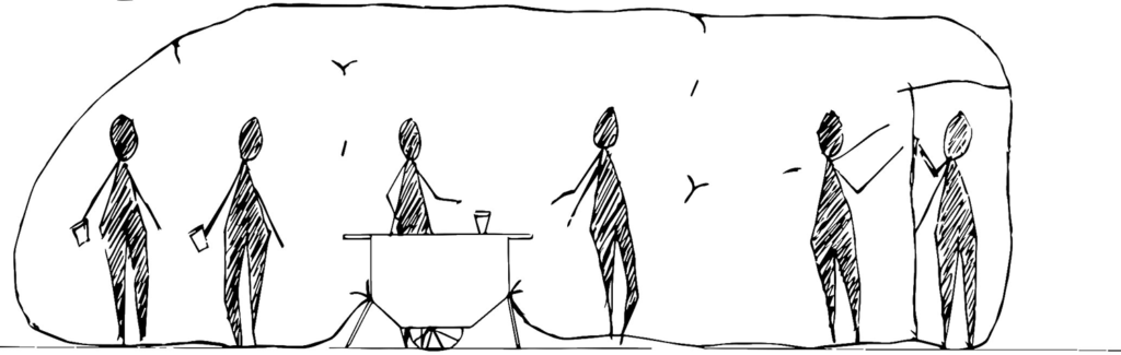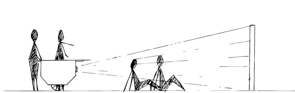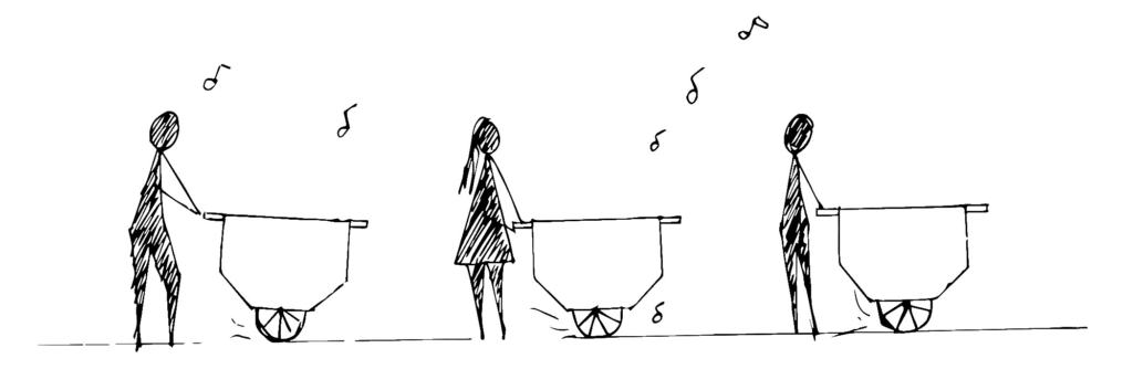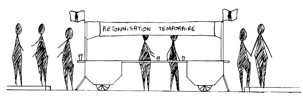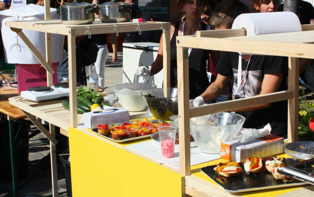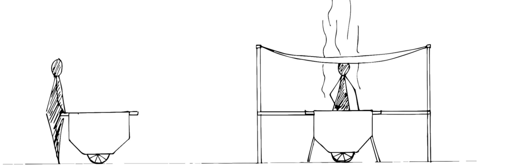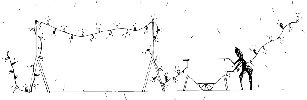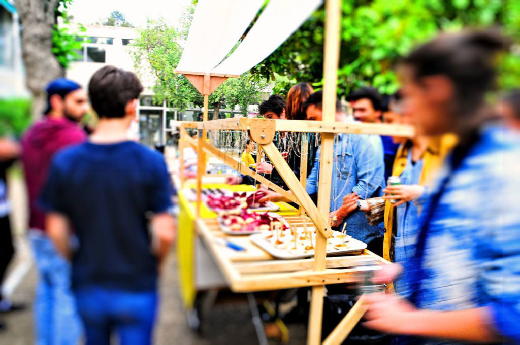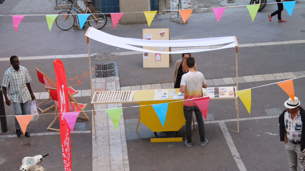 Création d’une carriole à l’occasion d’un repas festif, afin d’offrir un espace de préparation de nourriture. Pensée pour se déplacer dans les Beaux-Arts de Marseille, elle peut se déplacer sur les « pas d’ânes » présents dans l’école et se déploie de part et d’autre une fois installée. Imaginée pour l’occasion, il est possible d’imaginer d’autres vies à la carriole : transporter du matériel de protection plein air, dérouler des mètre de guirlandes en un temps record, etc.
