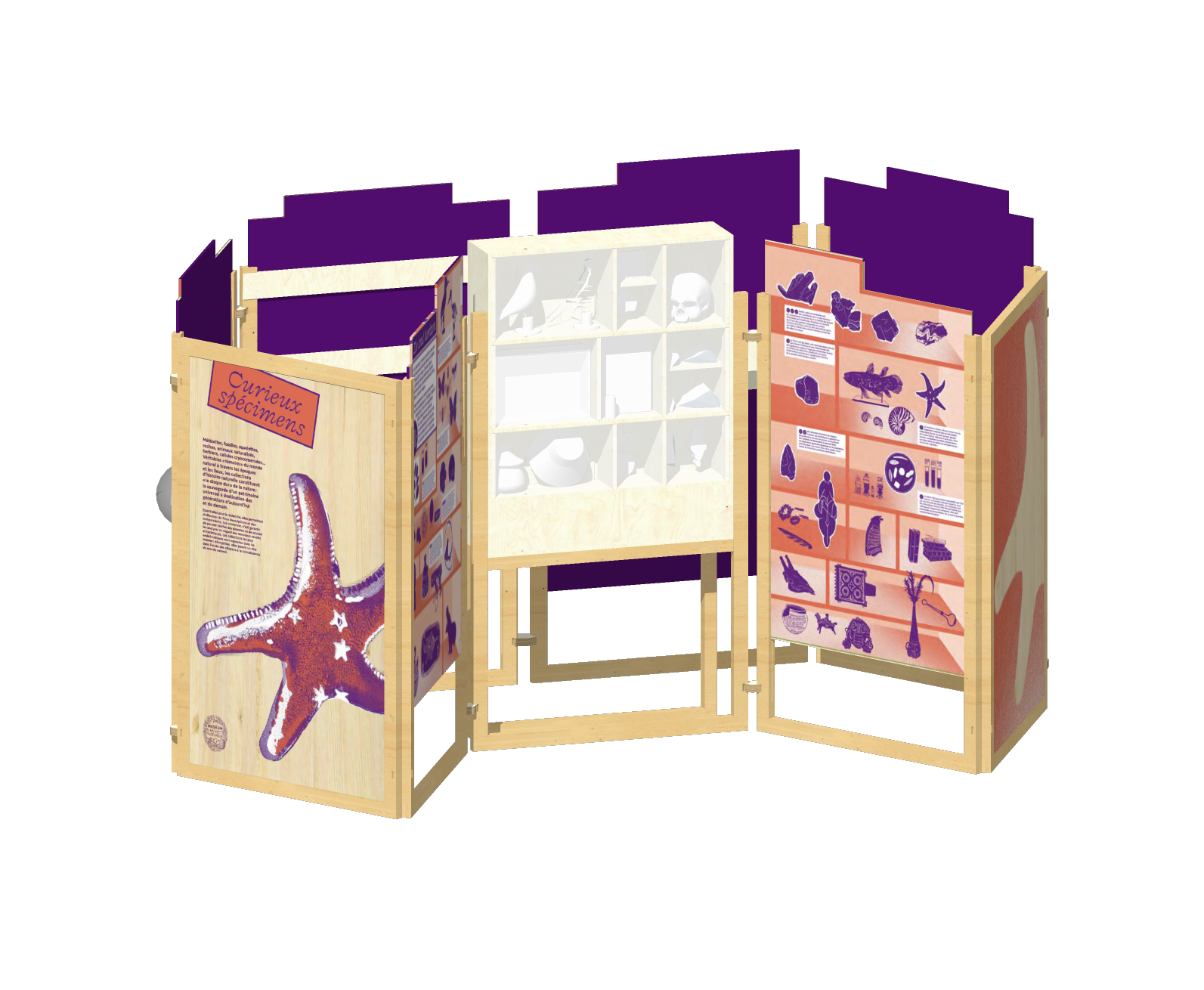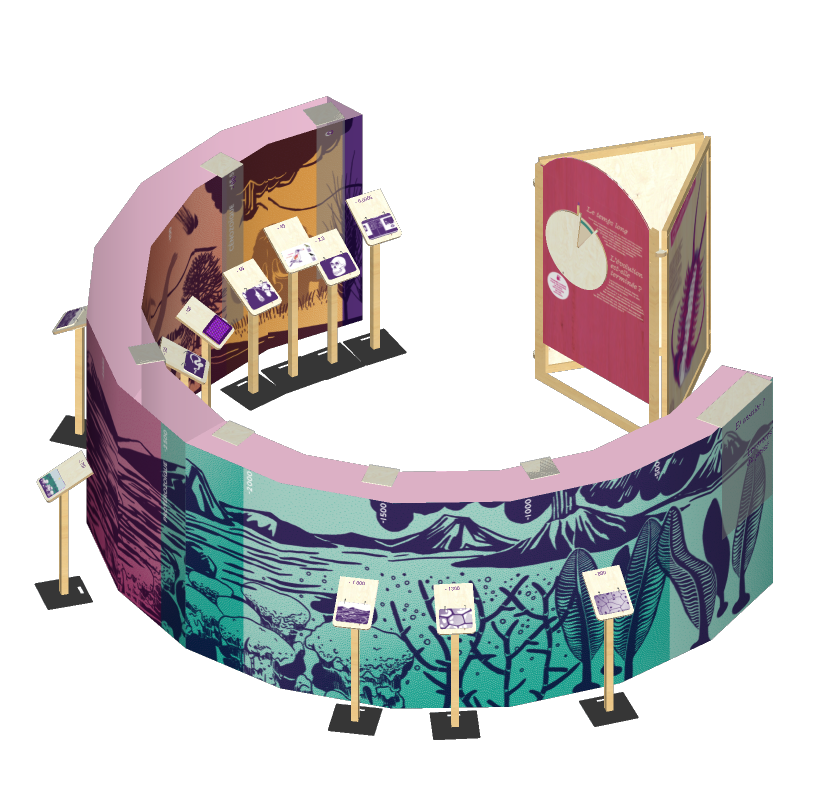 5 modules d’exposition itinérants sur le thème de l’Histoire Naturelle — Etude technique, prototypes et réalisation à partir de la conception de Prémices & co. Graphisme : Atelier Terrains Vagues – Elsa Varin. Illustrations : Sophie Fernandez.