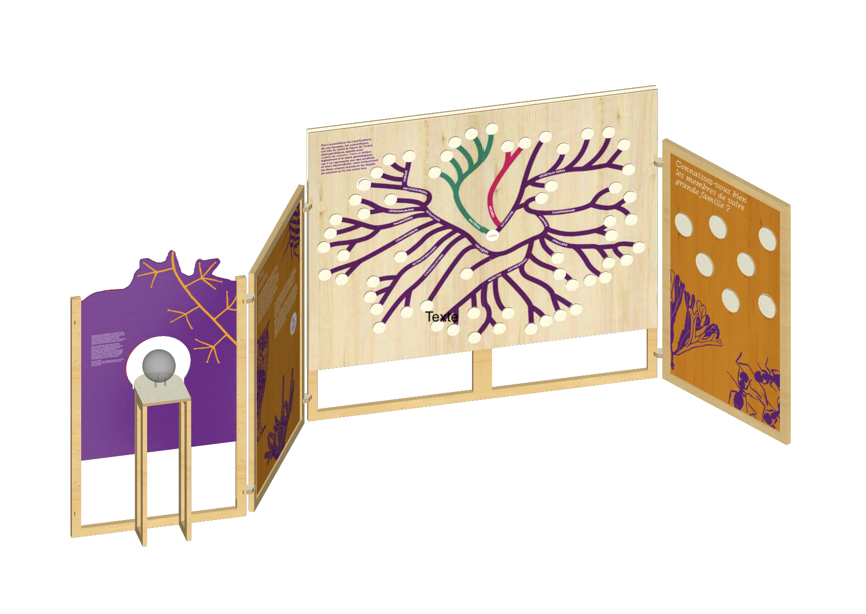Les modules Pop’up se déploient dans une diversité de lieux grâce à un système de cadres en bois, assemblés entre eux grâce à des pièces d’assemblages et des sangles. Un rainurage du cadre permet d’y insérer des panneaux graphiques en carton, et de moduler leur hauteur suivant les besoins. Les modules thématiques présentent des textes, du graphisme, des illustrations, des objets ainsi que diverses manipes : clapets à soulever, à glisser, engrenages à faire tourner, tirettes à actionner, lunettes filtrant un contenu, etc.